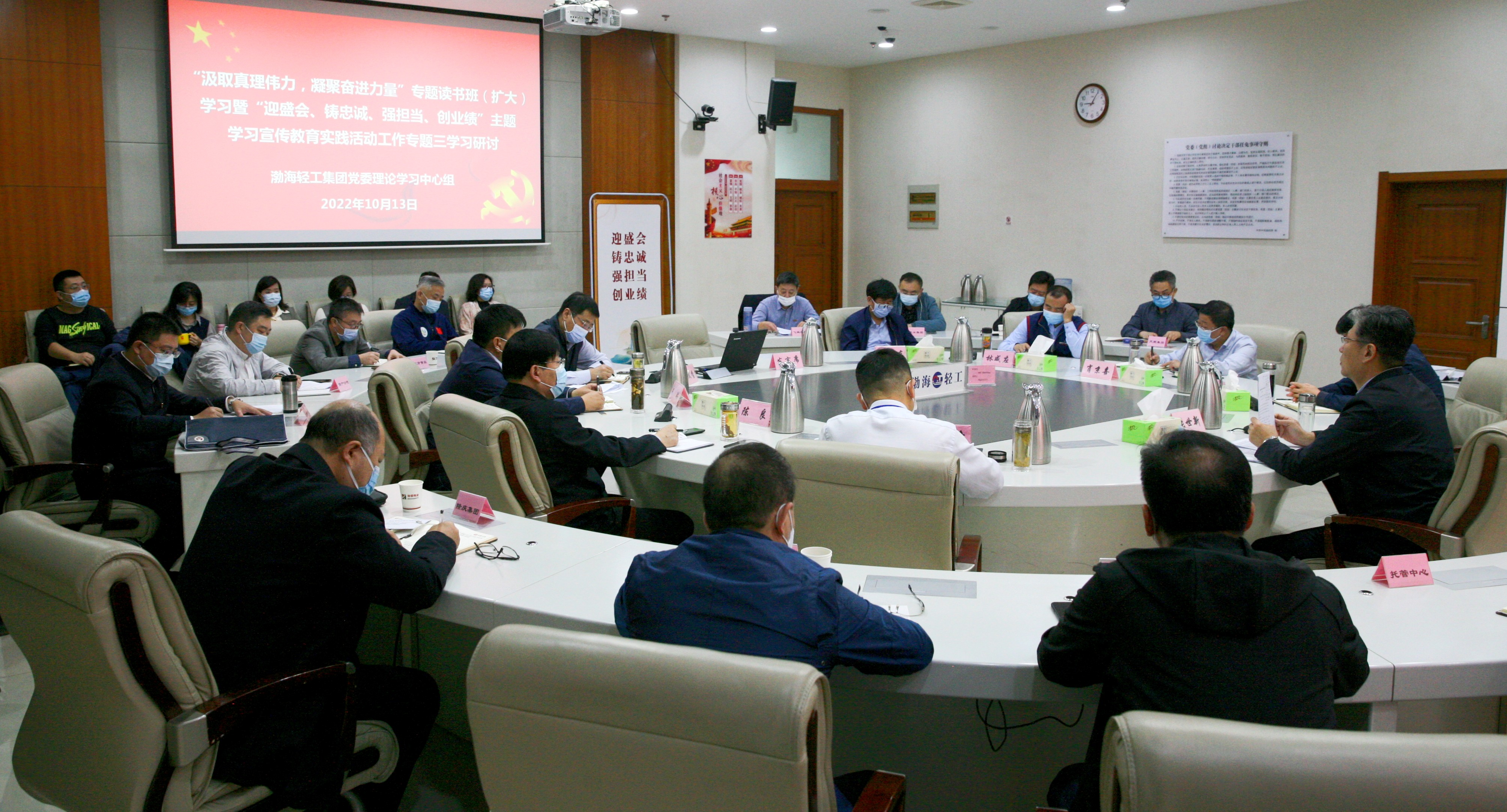10月13日上午,渤轻集团举办“汲取真理伟力,凝聚奋进力量”专题读书班(扩大)学习暨“迎盛会、铸忠诚、强担当、创业绩”主题学习宣传教育实践活动工作专题三学习研讨,集团公司党委书记、董事长张世新主持学习,集团公司领导班子成员,各公司、直属单位党组织主要负责同志,集团总部各部室长参加。